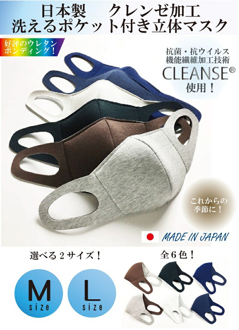 【日本製】クレンゼ 抗ウイルス加工 洗えるポケット付き 立体マスクサイズ:M、Lカラー:全6色洗っても持続する抗ウイルス効果。飛沫、花粉対策の他に、市販の抗菌ガーゼなどを入れることも可能。息をしても崩れない安定形状
